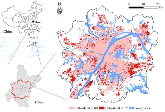 - Land-use maps of 2009 and 2017 in vector format were obtained from Wuhan Natural Resources and Planning Information Center. The original land-use maps were categorized into 38 classes and, then, reclassified into nine land-use types: urban land, rural settlements, cropland, orchard land, forests, grassland, waterbodies, traffic land and other land.