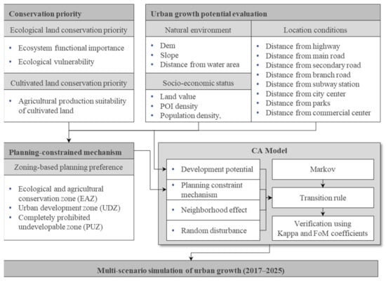 A planning-constrained CA model is developed in this study to simulate urban growth and encroachment under different scenarios. Figure 2 shows the model procedure and flowchart. Firstly, cell-based conservation priority and urban growth potential can be calculated by multi criteria analysis and a logistic regression model, respectively. In terms of conservation priority, it consists of ecological land conservation priority and cultivated land conservation priority. The ecological priority is mainly based on relevant indicators such as ecosystem functional importance and ecological vulnerability, while the cultivated land conservation priority mainly depends on the agricultural production suitability of cultivated land. The urban development potential is determined by natural, socioeconomic and location-based factors. Secondly, we defined the synthetical planning-constrained mechanism by integrating the cell-based tradeoff between urban growth potential and conservation priority with zoning-based planning preference. By adjusting the preference parameters of different planning zones, multiple planning-constrained urban growth scenarios can be generated. Thirdly, we combine the synthetical planning-constrained mechanism with urban development potential, neighborhood effect and random disturbance to construct the transition rule of urban CA model. Markov chain is used to predict the amount of urban land-use change. Kappa and FoM coefficients are used to calibrate and verify the model. Finally, future urban growth pattern under different scenarios are simulated. These phases are presented separately as following.