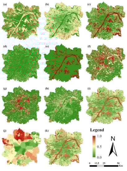 Urban growth is often at the expense of the loss of ecological land and cultivated land [,,]. In this study, conservation priority includes ecological land conservation priority (ELCP) and cultivated land conservation priority (CLCP). For an ecological land unit such as forest land, grassland, water area and garden land, its conservation priority depends on relevant factors of ecosystem functional importance and ecological vulnerability [,], while for a cultivated land unit, its conservation priority should also consider agricultural production suitability [].