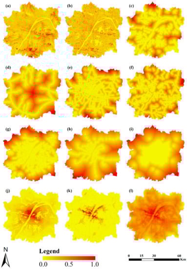 Urban growth potential evaluation indicators and results. (a) dem; (b) slope; (c) distance from water area; (d) distance from highway; (e) distance from main road; (f) distance from secondary road; (g) distance from branch road; (h) distance from subway station; (i) distance from city center; (j) land value; (k) population density; (l) urban growth potential.