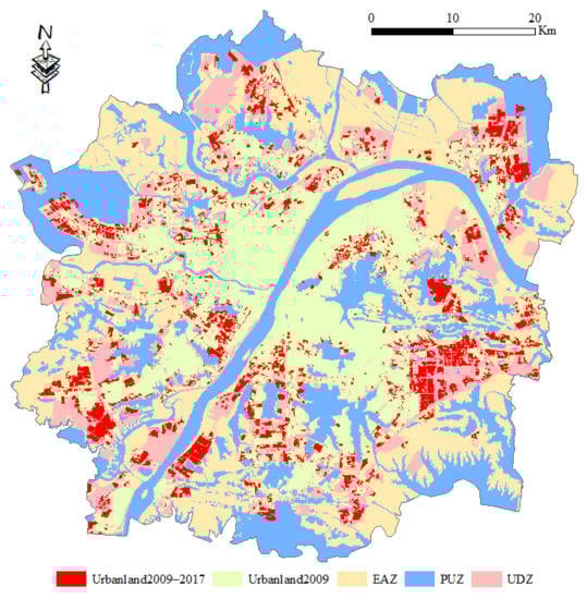 Based on the land-use maps in 2009 and 2017, we obtained the spatial pattern of urban growth in the WUDA from 2009 to 2017. Then, by superimposing it with the integrated urban spatial planning map, the spatial distribution of urban growth in different planning zones was produced, as shown in Figure 5. In addition, through further statistical analysis, the area and proportion of urban growth and encroachment on other lands in different planning zones are calculated, as shown in Table 3. During 2009–2017, the urban growth of the WUDA presented obvious infilling and edge sprawling characteristics, with a total area of 26,351.21 ha. At the same time, the expansion of urban land has led to the occupation of cultivated land, forest land, garden land, grassland and water areas. Among them, the occupied area of cultivated land accounts for 57.96% of the increased area of urban land, the occupied area of water area accounts for 23.69%, and the occupied areas of forest land, garden land and grassland account for 4.25%, 1.96% and 1.96%, respectively. These show that the urban growth in the WUDA during 2009–2017 is mainly at the cost of the reduction in cultivated land and water area. In addition, we found that the integrated urban spatial planning of Wuhan has an obvious guiding and restricting effect on the expansion of urban land at this stage, with 73.26% of the new urban land occurring in the UDZ. However, the urban land expansion beyond the preset UDZ should not be ignored, with 23.53% of the new urban land appearing in the EAZ, and even 3.21% in the PUZ.