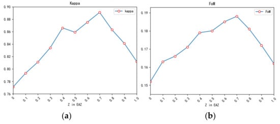 Figure 6 shows the changes in the Kappa index and FoM coefficient with the adjustment of planning constraints during the verification process. The results show that with the increase in planning preference coefficient of AEZ planning zone, Kappa index and FoM coefficient increase first and, then, decrease, which means that the simulation accuracy has the same change trend. The planning preference coefficient indicates the preference degree of different planning zones for urban growth relative to ecological or agricultural protection. The results show that the actual urban growth violates the urban spatial planning to a certain extent and pays more attention to urban development than ecological and agricultural protection. When the ZEAZ value is 0.7, the accuracy of the model is the highest. This shows that from 2009 to 2017, the urban growth of the WUDA is based on the development strategy that urban growth takes precedence over ecological and agriculture protection. Although this development strategy considers the trade-off relationship between urban development and ecological and agricultural protection to a certain extent, it obviously pays more attention to the economic benefits brought by urban development and largely ignores the ecosystem functional importance, ecological sensitivity and agricultural production suitability in the EAZ. This will cause higher risk of ecological and agricultural loss and further lead to the deterioration of ecological environment and the reduction in grain production.