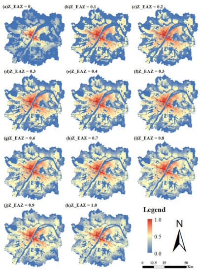 Figure 7 shows the spatial distribution of urban growth probability under different planning constraints, which is calculated by the method described in Section 3.2. It can be found that with the adjustment of planning zoning preference parameters, the transition probability map of urban growth shows obvious differences. Overall, with the increase in ZAEZ, the area of land with high transition probability increases significantly, showing obvious influence of planning constraints. From the perspective of the planning zone, the land located in the UDZ shows significantly higher transition probability and remains unchanged with the increase in planning zoning preference parameters, mainly because the planned UDZ is often located around the existing urban land, and it is not affected by the spatial containment function of the planning zone. The land in the EAZ shows obvious spatial heterogeneity, which is mainly located at the urban fringe and suburban area. The farther away from the urban center, the lower the transition probability. At the same time, with the reduction in the planning zone preference parameters, the effect of planning constraints enhanced, resulting in lower transition probability. When the ZEAZ = 0, it means that the EAZ is subject to the strictest planning constraint, and the urban growth probability of all land located in this area is 0. When ZEZA = 1, it means that the EAZ is not affected by the planning constraint; thus, its transition probability only depends on its urban growth potential. When the ZEAZ < 1, it means that the transition probability of the EAZ area depends on the joint action of conservation priority and urban growth potential, and the land with higher urban growth potential and lower conservation priority is easier to convert to urban land. The transition probability of the land located in the PUZ is always 0, because it is subject to the strictest planning constraint.