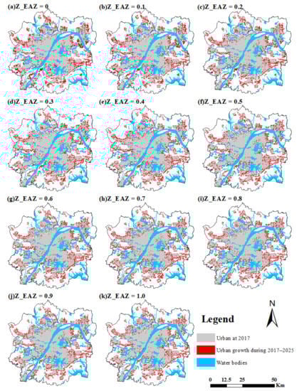 Multi-scenario analysis of planning constraints on the urban growth process has been conducted in this study. By adjusting the planning preference parameters of different planning zones, multiple planning-constrained urban growth scenarios can be derived. Considering the actual situation, the planning preference parameters of the UDZ and PUZ were preset to 1 and 0, respectively. To model the actual planning preference in the EAZ, 11 values, ZEAZ∈ {0,0.1,0.2,0.3,0.4,0.5,0.6,0.7,0.8,0.9,1}, were selected to generate different planning constraints. Among these values, 0 means corresponding planning zone is completely unbuildable, and 1 means corresponding planning zone has no planning restrictions on urban development. Then, multiple scenarios of urban land patterns were simulated for Wuhan in 2025 through integrating the multiple planning constraints into the urban CA model.