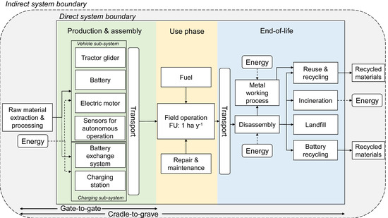 The scope of the LCA was limited to production and assembly, use phase and end-of-life of two small BEV agricultural field tractors, as described in Section 2.1. Comparisons were made between a vehicle system consisting of these vehicles and a vehicle system consisting of a conventional manned diesel-powered tractor. A full cradle-to-grave (CTG) analysis was made, and the gate-to-gate (GTG) aspect was also assessed separately.