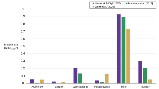 The conventional tractor used for comparison was assumed to be a 250 kW tractor, using field tractor data from Nemecek and Kägi [33]. This included raw material extraction, manufacturing, assembly, maintenance and disposal steps of the life cycle. However, these factors are often aggregated to the manufacturing phase in the presentation of results in this paper. The model used the tractor mass as a quantifying unit for the inventory. The unloaded weight was assumed to be 10,800 kg, which was based on the average weight of modern tractor models with approximate power 250 kW (Valtra S294, Fendt 933 Vario, John Deere 7R330). The mass and inventory data were verified with data taken from [20] for a 246 kW tractor with mass 10,950 kg. The exact composition tends to vary between data sources, but steel and ductile iron are key components, with rubber (in the form of tyres) and oil frequently cited as a large part of the maintenance materials used [20,32,33,46]. A comparison of key materials from different sources by weight can be seen in Figure 2.
