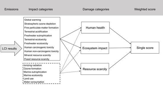 - Huijbregts, M.A.J.; Steinmann, Z.; Elshout, P.M.F.; Stam, G.; Verones, F.; Vieira, M.; Zijp, M.; Hollander, A.; van Zelm, R. ReCiPe2016: A Harmonised Life Cycle Impact Assessment Method at Midpoint and Endpoint Level. Int. J. Life Cycle Assess. 2017, 22, 138–147. [Google Scholar] [CrossRef]