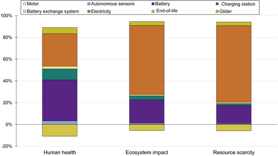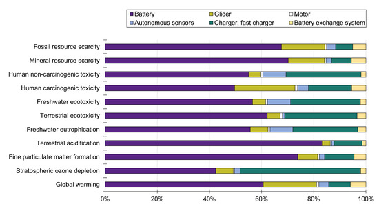 The results of the CTG analysis showed that for all impact categories studied, the manufacturing of the batteries and the electricity used as fuel were responsible for the majority of the impacts (Figure 6). This indicates the need to focus on these parts when analysing the overall impact of the system. The impact factors concerning mineral resource scarcity, human toxicity, ecotoxicity, eutrophication and acidification comprised most of the impact from battery manufacturing. The remaining categories, mainly global warming, ozone depletion and fossil resource scarcity, comprised most of the impact from electricity use (66–71%). Apart from these, the highest impact was generally seen for the charger infrastructure and glider manufacturing. The full results can be seen in Supplementary Material S2.