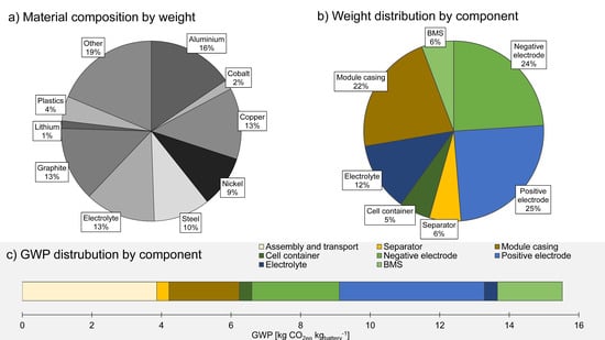 Weight distribution for the nickel cobalt aluminium-graphite electrode (NCA-C) battery module by (a) material (b) and component, and (c) the global warming potential (GWP) impact by component.