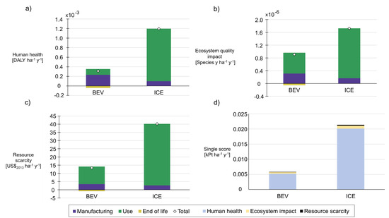 Comparative results for the battery electric vehicle (BEV) system and internal combustion engine (ICE) system in the damage assessment categories (a) human health, (b) ecosystem impact and (c) resource scarcity, as well as (d) Single score in the Hierarchist perspective according to the guidelines and values in [60].