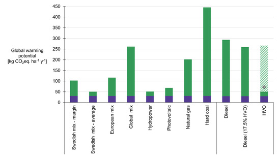 Because the use phase was impactful for both the BEV and ICE cases, the fuel used is of great importance. The difference between the best case for electricity (hydropower) and the worst case (hard coal) was close to a nine-fold increase in climate impact. Of all the electricity sources assessed, hard coal was also the only one with a worse climate impact than the ICE system. Electricity origin was also important for the overall results, as there was a large difference in the total GWP of the system when using Swedish (102 kg CO2eq.ha−1 y−1), European (116 kg CO2eq.ha−1 y−1) or global electricity mix (262 kg CO2eq.ha−1 y−1). Choosing Swedish marginal mix over Swedish average mix also doubled the total GWP impact. Based on these results, it seems that all other assumptions were eclipsed by the origin of the electricity in the use phase. This is also partly true for on-road BEVs, but the more intense use of work machinery and the higher yearly energy use in agriculture make the choice of electricity even more important for that class of vehicles. There are large reductions to be gained in changing to a BEV system, but choosing low-impact electricity is vital.