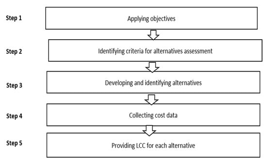 The LCC can be conducted by applying five steps [24] (Figure 2). The LCC approach is summarized in Figure 2. The first stage is to set goals for analysis. Setting defined objectives is a necessary component for running an LCC. The second step is to make a record of the overall cost and payback. The third stage is to create alternate scenarios and a base case. The fourth phase is to collect utility, construction, maintenance, and service costs for each choice. The fifth stage is to apply a life cycle cost analysis to each choice.