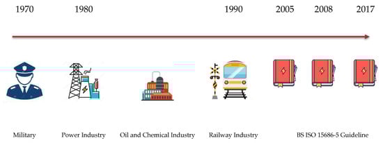 Figure 3 depicts the progression of the LCC application. It is clear that the first user of LCC was the military of the USA from 1970s to 1980s. After that, LCC was applied in different industrial sectors, including the oil sector (in 1980) and chemical industry, power industry, and railway industry [18]. In October 2005, the first guideline for LCC evaluation was established [24]. Three years later, the BS ISO 15686-5 (2008) provided a guideline for LCC that is standard and easily applicable. After nine years, the BS ISO 15686-5 (2008) guideline was revised, and a new guideline was produced, which is BS ISO 15686-5 (2017) (Figure 3). In 2010, [26] claimed that the reason of inefficient studies on LCC is a lack of standard approaches. LCC does not account for environmental and social costs of products [27]. Besides, there is a lack of agreement in the method [28,29,30,31].