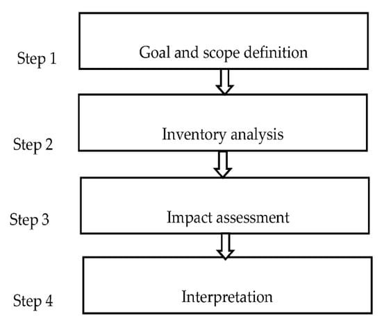E-LCA are able to mitigate environmental impacts of products in their life cycle. It can be called cradle-to-grave as a tool for environmental sustainability evaluation of products, process, and services [38]. E-LCA can be evaluated by following four steps, which are: (1) goal and scope definition: where the rationale for conducting LCA is outlined, as well as the scope of research, functional unit, and approach are detailed; (2) inventory analysis: where the system boundaries and processes are discussed; (3) impact assessment: this can be followed by weighing and normalization; (4) interpretation: at this stage, two earlier findings are combined to arrive at conclusions and suggestions (Figure 4) [36].