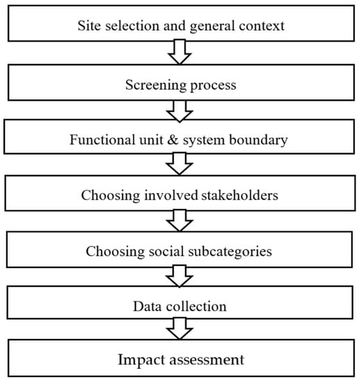 In the 1900s, LCA experts discussed the consideration of a social aspect in the life cycle assessment approach [40]. O’Brien et al. (1995) [40] developed a comprehensive and novel approach called SE-LCA (social and environmental life cycle assessment) by combining S-LCA (social life cycle assessment) with E-LCA (environmental life cycle assessment) [40]. Gauthier eta al. (2005) [41] introduced social indicators to evaluate social performance of products throughout their life cycle. In the following year, Dreyer et al. (2006) [42] provided a framework for social life cycle assessment, but the framework did not mention that the method can collect data for social LCA. Three year later, the United Nations Environment Program [2] in 2009 provided a guideline for social life cycle assessment [2], which was still an infant and under development. The guidelines determine negative and positive impact of social aspects of products through its supply chain [2]. The guidelines provide seven steps for S-LCA (Figure 5) [2]. In the social life cycle assessment guideline, social impacts on stakeholders throughout the life cycle of production and consumption are accounted for. Stakeholders are divided into five categories, including impact on workers, local communities, consumers, the society, and all value chain actors [2]; and six impact classes, which are human rights, health, working environment, cultural heritage, socio-economic response, and governance [2]. The selection of indicators completely depends on the goal and scope of the study [2]. A new version of S-LCA has been produced since then. In the new guideline [4], children have been added as a new stakeholder. Besides that, new subcategories have been created, for example, sexual harassment and smallholders including farmers. In the new guideline, two impact assessment approaches are provided. For evaluation of social performances and social risk assessment, a reference scale method can be used. The impact pathway approach is introduced for assessment of potential social impact [4].