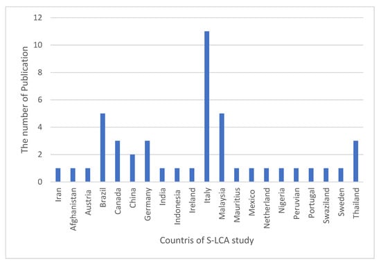 Countries with case studies of S-LCA were Iran, Italy, Malaysia, Germany, China, Portugal, Afghanistan, Swedish, Nigeria, Netherland, Swaziland, Brazil, Ghana, Ireland, Indonesia, Mauritius, Thailand, Brazil, South Africa, Canada, India, Mexico, Peru, and Turkey. With eleven S-LCA studies published, Italy has the most S-LCA usage. (Figure 6). Italy undertook S-LCA research in the agricultural, tourism, wine, jewelry, and honey producing industries. Malaysia and Brazil are the second largest cases of S-LCA study after Italy, with five publications in palm oil production, freight transport system, cocoa production, and ethanol production. The application of S-LCA as a decision-making tool in developing and in third-world countries are increasing (Table 1).