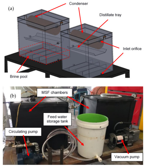 (a) Schematic view of the small-scale MSF desalination unit with two stages, (b) The MSF experimental setup containing main components.