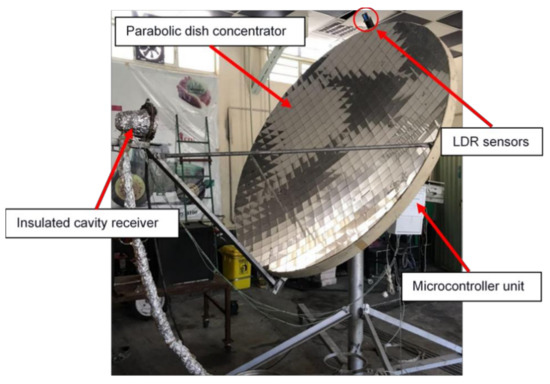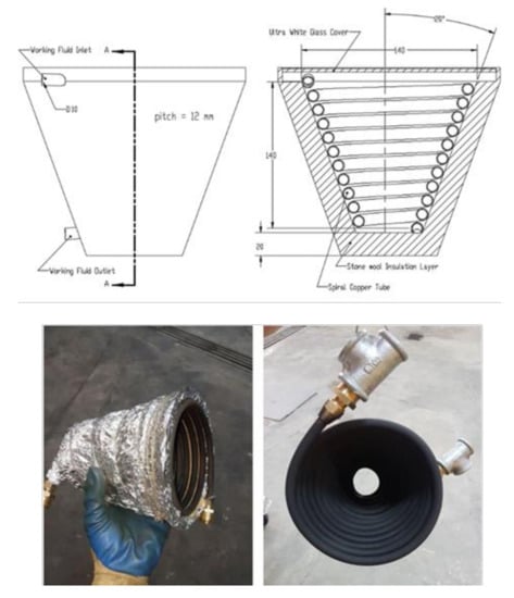 A point-focus parabolic solar dish equipped with a two-axis sun tracker system comprising of LDR photoresistor positioned at the top of the concentrator and connected to a microcontroller was used as the thermal energy source of the system (Figure 2). In this type of concentrator, the sun rays are reflected on the receiver’s aperture area positioned at the focal point of the parabolic dish, increasing the fluid’s temperature inside a conical cavity receiver. The cavity receiver was made of copper tubes and coated with a particular matte black color which could tolerate heat up to 700 °C to absorb the highest amount of solar energy. The outer surface of the receiver was covered with a stone wool insulation layer and an ultra-white glass cover was placed on the aperture of the receiver to prevent heat losses as shown in Figure 3. Additionally, Table 1 represents the parameters of the solar PDC and its receiver.