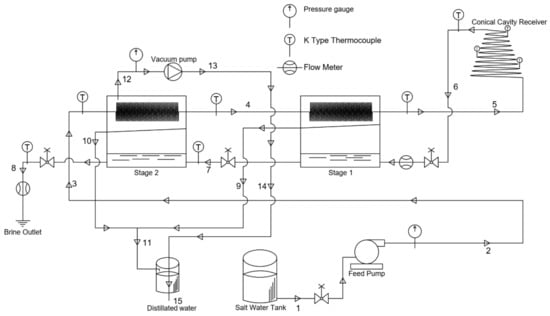 The saltwater circulation through the system (as shown in Figure 1) was carried out using a 0.5 hp water pump. A Platinum DV-42N vacuum pump was used to control the amount of vacuum pressure inside flashing chambers. Half of the tests were performed with a vacuum in the second chamber to investigate the effect of pressure drop on the MSF plant’s productivity. The values for operational parameters during the experiments are presented in Table 3.