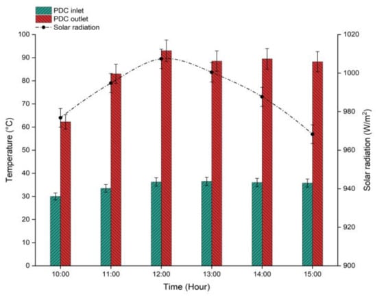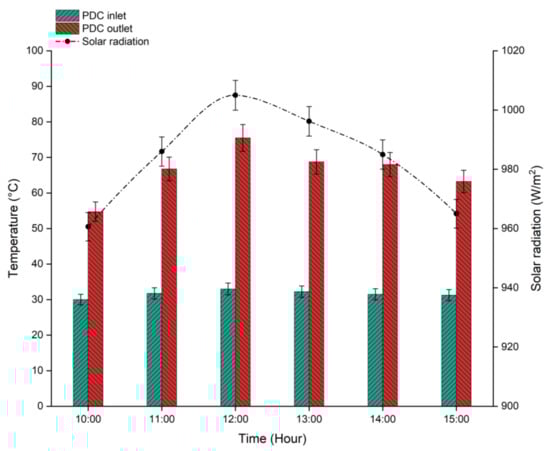 Measured temperatures of flowing water at the inlet and outlet of the PDC (day: 14 July 2020).