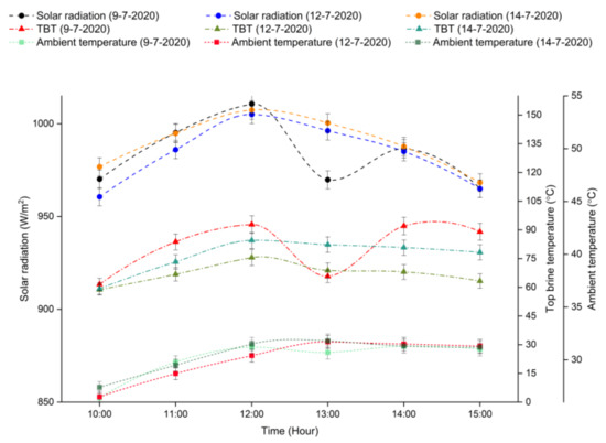 Figure 9 shows the variation of measured environmental data such as solar radiation, ambient temperature and TBT during evaluations. On day 9 July 2020, the maximum value of the air temperature near PDC was measured as 31.4 °C. The highest amount of the measured ambient temperature for the following days was measured as 31.7 °C and 31.8 °C, respectively. It should be noted that, in every day of evaluation, as solar radiation was increased with time until midday and then decreased gradually, the air temperature was almost constant after the midday, and wind velocity had no particular pattern. According to the measured environmental data, solar insolation was found to be the most influential factor in increasing the TBT value.
