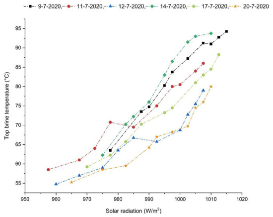 Figure 10 shows the values of measured TBT corresponding to the solar radiation in each evaluation day until midday. TBT values are affected by the incident solar insolation. As mentioned before, the saline water’s temperature rises when it goes through the solar PDC’s receiver. The linear relation between TBT rises and available solar radiation indicates solar radiation’s impact on the process of solar desalination. The solar radiation ranged from 960 W/m2 to 1015 W/m2, causing TBT to be changed from 55 °C to 95 °C. Moreover, as described in Equation (21), one of the critical factors affecting the amount of the gained heat by the flowing water inside the chambers of the MSF unit is the feedwater flow rate. As shown in Figure 10, the brine temperature raise on days with similar feedwater flowrate are matching. The mean difference between brine temperature rise values between different experimental days was in the range of 6.7 °C (between flow rates of 0.7 and 1 L/min) and 8.5 °C (between flow rates of 1 and 1.3 L/min). Even though environmental conditions significantly affect a solar desalination system, parameters such as ambient temperature and wind speed did not significantly affect the system. Gorjian et al. [23] reported similar results for the effect of the environmental parameters on the productivity of their system. TBT value is one of the key design factors for an MSF desalination system. Based on a study by Hanshik et al. [27] increasing the TBT will result in more freshwater production. Therefore, the TBT value must be constant during the desalination process to control the production. Throughout experiments, it was observed that the TBT values were fluctuating, corresponding to the solar radiation. In this way, a thermal storage system (TES) is needed to control the TBT values and continues production during nighttime.