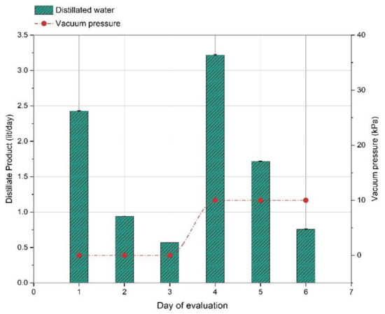Daily distillate production of the system and corresponding vacuum pressures during evaluations.