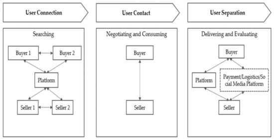 Service value co-creation processes are reciprocal and interdependent and these participants learn from each other, and the buyers are also value co-producers [54]. Xianyu as a platform business provides services to both sellers and buyers (prosumers). Based on the process of service transaction on the platform, we divided the stakeholder interactions into three phases: the user connection stage, which is the pre-purchase period when prosumers actively engage in searching; the user contact stage, or the purchasing period when users negotiate between each other; and the user separation stage, the post-purchase period where buyers receive the delivery of service and evaluate. Figure 1 describes the three stakeholders interaction mode in different stages. We next discuss the value co-creation process based on these three stages.