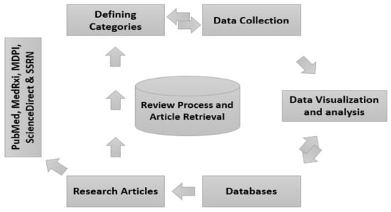 Different online sources were used to retrieve the relevant articles and publicly available data for reporting the effects of COVID-19 on the four mentioned categories. To retrieve articles related to each category, we first consulted the primary sources: official websites of scientific journals and conferences. The websites chosen for the study were PubMed, MedRxiv, MDPI, Elsevier, ScienceDirect, and SSRN. Search phrases to be used on the search engines of these websites were carefully designed to exhaust the database of each website and retrieve a maximum number of relevant articles. Figure 1 provides an overview of the article retrieval process.