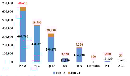 Coronavirus Disease 2019 (COVID-19) has caused serious damage worldwide, including deaths and health issues and severely denting global economies [,]. Australia is no exception to such effects and has seen its share of economic impacts. The first COVID-19 case was confirmed in Australia in January 2020, when a positive patient traveled from Wuhan to Melbourne []. Victoria has seen nearly four times the number of COVID-19 cases as New South Wales despite being the smaller state of the two and spending more time in lockdown. The Australian government took drastic measures to prevent the virus from spreading across the states and imposed strict border and travel restrictions. These measures adversely impacted several small businesses such as local cafes, restaurants, childcare, rental houses, and hotels []. In addition, the airline and tourism industry suffered heavy losses due to both local and international travel restrictions.