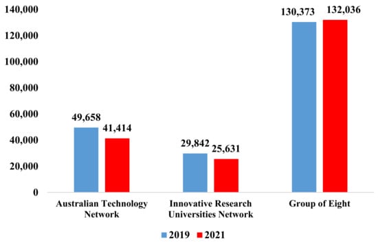 Australian universities can be divided into three main groups: the Australian technologies network, the innovative research universities network, and the group of eight. The Australian technologies network consists of universities such as the University of Technology Sydney, RMIT University, and Deakin University, where a decline of more than 8000 students has been observed from 2019 to 2021. It must be remembered that these universities have maintained their number of enrollments from previous years and observed a steady increase over the years. This makes it even more concerning when the universities fail to maintain their number of enrollments from previous years. The next group is the innovative research universities network, consisting of universities such as Western Sydney, James Cook, and Griffith University. Again, this group saw a major decline, missing their 2019 enrollments number by around 14%. The only group that successfully managed to maintain their numbers is that of the Group of Eight, consisting of universities such as the University of Sydney and the University of NSW. However, these universities generally see a significant rise in enrollment every year, and barely maintaining the numbers from 2019 means the universities have not met their previous trends. Figure 4 developed by the authors based on [] (https://www.smh.com.au/national/nsw/regional-universities-are-going-to-struggle-the-unis-worst-hit-by-COVID-19-20210622-p583be.html, accessed on 9 July 2021) compares the enrollments in the three universities’ groups for 2019 and 2021.