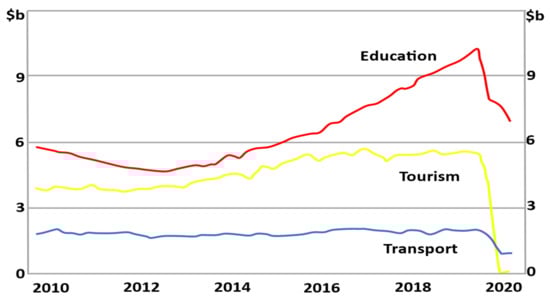 In 2019 the Australian education export totaled AUD 40 billion, including 17 billion tuition fees and AUD 23 billion living expenses of the international students. China accounted for one-third of Australian education exports as most Chinese students aspire to get an education from a reputable leading institute in Australia [,,]. Other South Asian countries, including India and Nepal, also contribute heavily to the Australian education sector. With the implementation of a travel ban and restrictions, many students could not travel to Australia []. Most of the international students have continued to take up online classes and learn remotely. This has given some relief to the education institutes. However, the associated industries such as transportation, accommodation and tourism, which are dependent on such visitors, have suffered a lot.