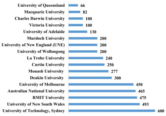 As a result of the decreased revenues, Australian universities have undergone serious job cuts, leading to increased unemployment in the education sector. Overall, Australian universities have seen more than 17,000 job losses []. Being Australia’s third-largest export, the education sector has suffered serious losses due to international border closures. These losses are expected to continue beyond 2021 as the universities battle to overcome the effects of COVID-19. Figure 7 shows the expected or confirmed number of permanent job losses in Australian universities. The figure was developed by the authors. It must be noted that these numbers do not include the massive reduction (in some cases, complete ban on) in the casual appointments. This has seriously impacted the educational sector in Australia.