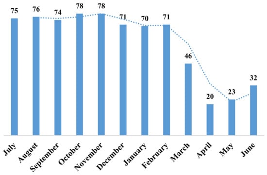 Figure 8 presents the hotel occupancy rates (in percentage) for the months of July 2019 to June 2020. A significant drop can be seen from March 2020 and onwards when the impacts of COVID-19 began in Australia. The graph was developed based on the data in [].