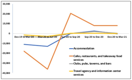 The employment rates across the hospitality and tourism industry were worst impacted due to COVID-19. Figure 9 displays the job trends across different sectors of the tourism industry. Due to restricted movements and travel, accommodations such as hotels, motels, Airbnb, resorts recorded an all-time low in reservations, leading to reduction in numbers of employees from −15% to −18% per quarter from March 2020 to March 2021 [,,]. In addition, cafes and restaurants offered limited dine-in facilities or takeaway services only. As a result, these businesses reduced staff heavily from March 2020 to June 2020. However, with limited options available and takeaway categorized as an essential service, the employment in the cafes and restaurants saw a positive surge after June 2020, adding about 11% additional staff to facilitate home deliveries [,,].