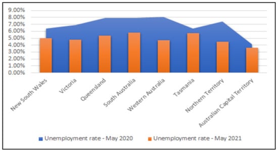 COVID-19 had significant impacts on the Australian labor market, though the statistics have shown improvement over the last few months. Due to the shutdown of the non-essential services and several other restrictions, unemployment rates had slipped to an all-time low of 7.10% in May 2020. However, with the coronavirus cases reducing and businesses resuming trade, the unemployment rates improved to 5.1% by May 2021 [,,].
