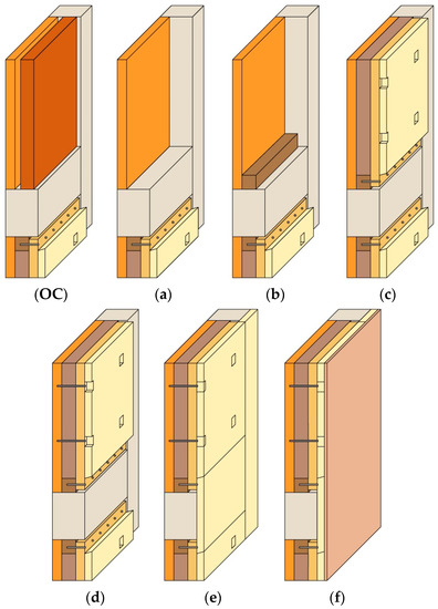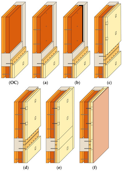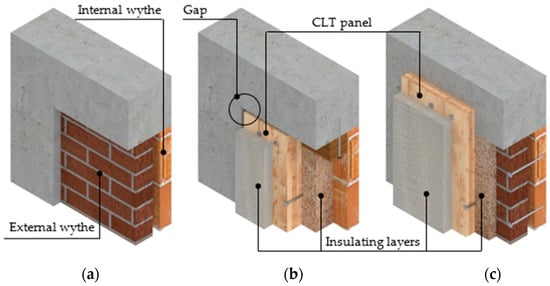 The proposed integrated retrofit solution entails the building envelope and aims to reduce: (a) the seismic vulnerability of concrete structures by preventing brittle mechanisms and favouring a ductile behaviour; (b) the energy consumption during the service life of the building. The proposed solution implies the installation of structural cross-laminated timber (CLT) panels that are connected to the RC elements through steel connectors. During the development of the proposed system, attention was paid to occupants’ disturbance. Indeed, starting from a typical masonry infilled frame, two intervention configurations characterized by different levels of invasiveness are presented. In particular, a double wythe masonry infill was assumed for the as-built configuration (Figure 1a), as it was considered representative of most of the existing RC framed buildings. In the most invasive configuration, named RC–TP (reinforced concrete–timber panels), the CLT panel is inserted in the RC frame by replacing the external wythe of the infill (Figure 1b), while in the least invasive configuration, RC–TPext (reinforced concrete–external timber panels), the CLT panel is installed from the outside without removing the masonry infill (Figure 1c). The intervention configurations are provided with insulating layers, placed on the inner side of the timber panel and on the outer side as well. The proposed insulating materials were designed to obtain optimal moisture and thermal responses, both in summer and in winter, thus granting good indoor comfort for the building’s occupants.