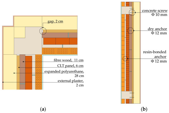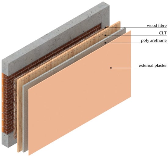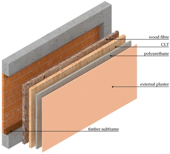 A 5-cm insulating layer made of wood-fibre panels fills the cavity between brick masonry and CLT panel. Continuous insulation made of 6-cm polyurethane is applied to the outer surface of the panel in the RC–TP configuration.