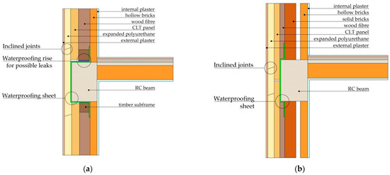 The use of timber elements requires specific precautions in order to avoid direct contact with water accumulation, which can cause severe degradation of the material. Designs should cover all conditions that can reasonably be expected during the construction and use of the structure [35], including rain infiltration, indoor vapour production, or possible pipe leaks. A constructive detail for the two intervention configurations is proposed. Particular attention was paid to avoiding contact between the timber and the concrete beam, through which water, coming from the subfloor, could flow (Figure 5). Water coming from the outside can be deviated with the correct design of junctions and flashings.