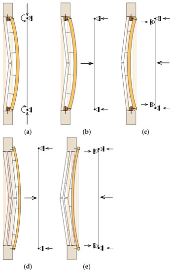 Static schemes used to analyse: RC–TP under (a) vertical load, (b) horizontal external out-of-plane load, (c) horizontal internal out-of-plane load; RC–TPext under (d) horizontal external out-of-plane load, (e) horizontal internal out-of-plane load.