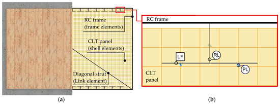 Regarding the system that governs the interaction between concrete and timber elements, in the RC–TP configuration it was modelled according to [21]. For the RC–TPext configuration, instead, a specific interaction system was developed for this study. As visible in Figure 11b, one-dimensional (1D) frame elements are placed at the midline of the concrete beams and columns to simulate the RC frame. The frame elements are connected to the bidimensional (2D) shell elements, simulating the CLT panel through a system composed of 1D frame and link elements. Specifically, the LF (line of fasteners frame) marks the line where the metal fasteners are inserted. The LF is rigid and works as a support for the panel-to-frame link (PL) elements, which reproduce the behaviour of each fastener in the timber-to-concrete. The LF is connected to the 1D elements of the RC frame through a rigid link (RL) that makes the LF move and rotate solidly with the RC frame. The PLs are nonlinear links whose behaviour was defined consistently with reference to [21].