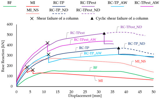 Figure 12 reports the results obtained considering the bare frame “BR”, the masonry infilled frame “MI”, the two retrofit configurations “RC–TP” and “RC–TPext”, and the two retrofit configurations with a stronger internal masonry wythe (see details in Table 4) “RC–TP_AW” and “RC–TPext_AW”.