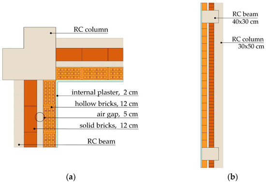 As the external masonry wythe is assumed to be strong, the RC–TPext configuration requires this wythe to be disconnected from the RC columns, leaving a gap of at least 3 cm. Such gap prevents the infill from transmitting additional shear stress to the columns during in-plane seismic oscillations. As mentioned before, the internal weak wythe lacks the stiffness and the strength to cause damage to the columns. Therefore, it is not required to disconnect the internal wythe from the RC elements.