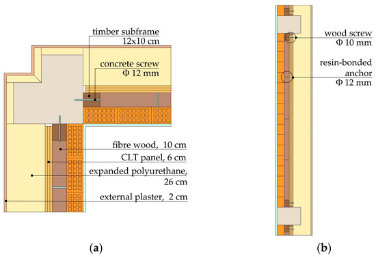 In order to speed up execution, the proposed retrofit solution can be partially prefabricated by bonding the CLT panel with the inner and outer insulating layer in the factory, reducing labour and implementation time. In the external insulating layer, a space should be left for the application of the steel connectors that would later be filled and sealed with insulating foam. Specifically, holes in the insulating layer are made for the insertion of the CLT-masonry fasteners (both for RC–TP and RC–TPext), while a ~10-cm strip of uncovered CLT is left at the top and bottom edges of the panel for installing the CLT-concrete (RC–TPext) or CLT-subframe (RC–TP) connections.