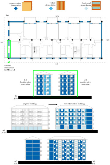 Finally, Figure 19d,e show that on the northeast and southeast facades the comprehensive intervention could be applied to all the frames, with the only exception being those delimiting the two stairwells, where horizontal strong-backs were used.
