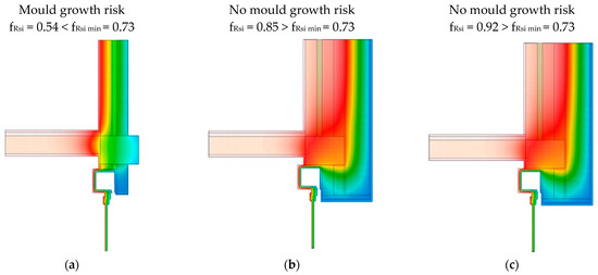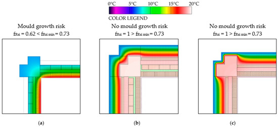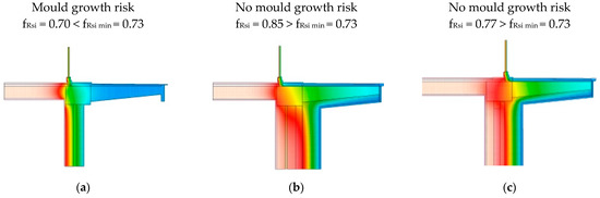 The constructive details for both intervention configurations were designed with attention paid to avoiding the possibility of superficial mould growth. The main thermal bridges were analysed, verifying that the calculated temperature coefficient (fRsi) was higher than the minimum temperature coefficient for mould growth risk (fRsi min) according to UNI EN ISO 13788 [45]. In Figure 22, Figure 23 and Figure 24, the analysed details are reported.