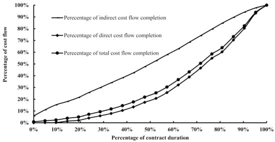 Figure 1 presents the cumulative percentage of the aggregated cost flow along with the direct and indirect cost flows against the contract duration (CD). As expected, the aggregated cost flow is a function of the direct cost flow, as the latter contributed to 85.39% of the total cost flow according to Table 3.