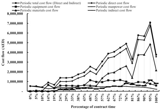 Lucko [] and Su and Lucko [] went beyond the prevailing techniques by introducing the use of singularity functions, which had been traditionally used in structural element analysis, into the domain of cash flow forecasting with the aim of understanding the underlying behaviour of the cash flows. However, the implementation of the proposed methodology required detailed information on the work items involved to complete a given project, thus leading to its inapplicability within contracting organizations. In the context of the UAE, a study conducted by [] that aimed to investigate the impact of negative cash flow trends on construction performance of building projects revealed that the deficit covered 30–70% of a given project duration and was most likely to take place after 50% of the project duration has elapsed. However, the cost flow was not categorized to its components (manpower, equipment, and materials), and it dealt with building projects only.