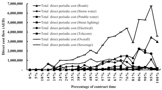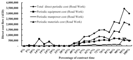 This subsection investigates the cost flow’s underlying patterns at the work package level; hence, the periodic total direct cost flow profile for each individual work package has been plotted in the graph shown in Figure 3. According to Figure 3, the deepest distortion, which was experienced at 81%, was caused by both the road and the electrical works. It has, therefore, been decided to further investigate the cost flow profiles for the individual cost components forming the total direct cost of these two packages to identify the cost component(s) responsible for this distortion and the associated reason(s) behind its occurrence.