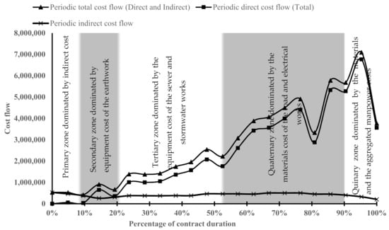 To visually illuminate the patterns of the cost flow trends discussed earlier, a graph has been plotted in Figure 6 that demonstrates the dominance of the individual cost component, as well as the work package during various time intervals of a given infrastructure project represented by the case study. The graph is divided into five distinct zones to characterize the dependency of the aggregated cost flow in accordance with the dominance of a given cost component, as well as a given work package.